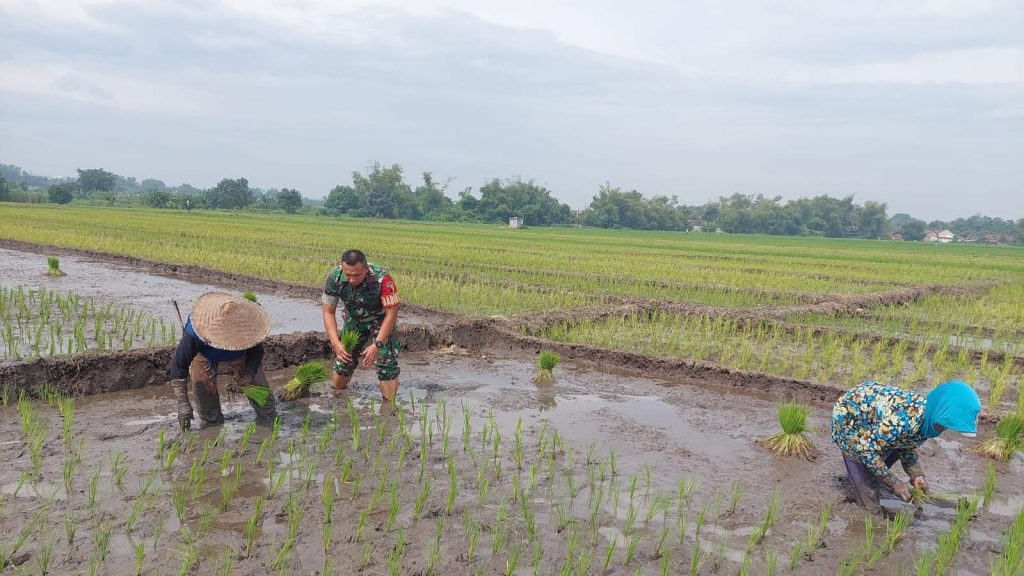 MOJOKERTO, RI-Babinsa Sekargadung Koramil 0815/11 Pungging Kodim 0815/Mojokerto Sertu Nanang Sumarna melaksanakan kegiatan pendampingan petani dalam kegiatan tanam padi di Dusun/Desa Sekargadung, Kecamatan Pungging, Kabupaten Mojokerto, Jawa Timur, Jumat (14/02/2025).