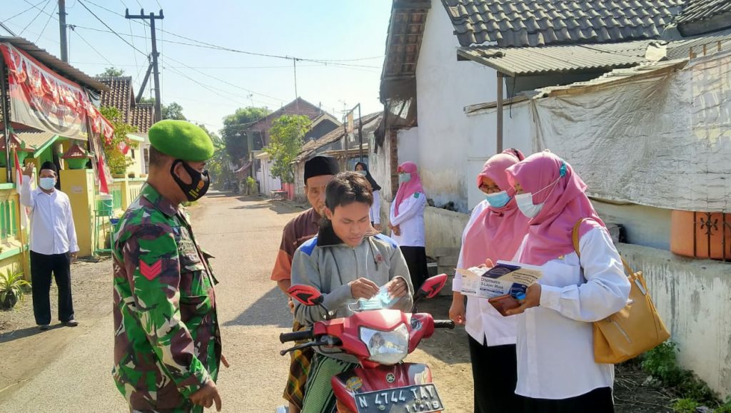 Babinsa Koramil Rejoso Bersama Perangkat Desa Bagikan Masker