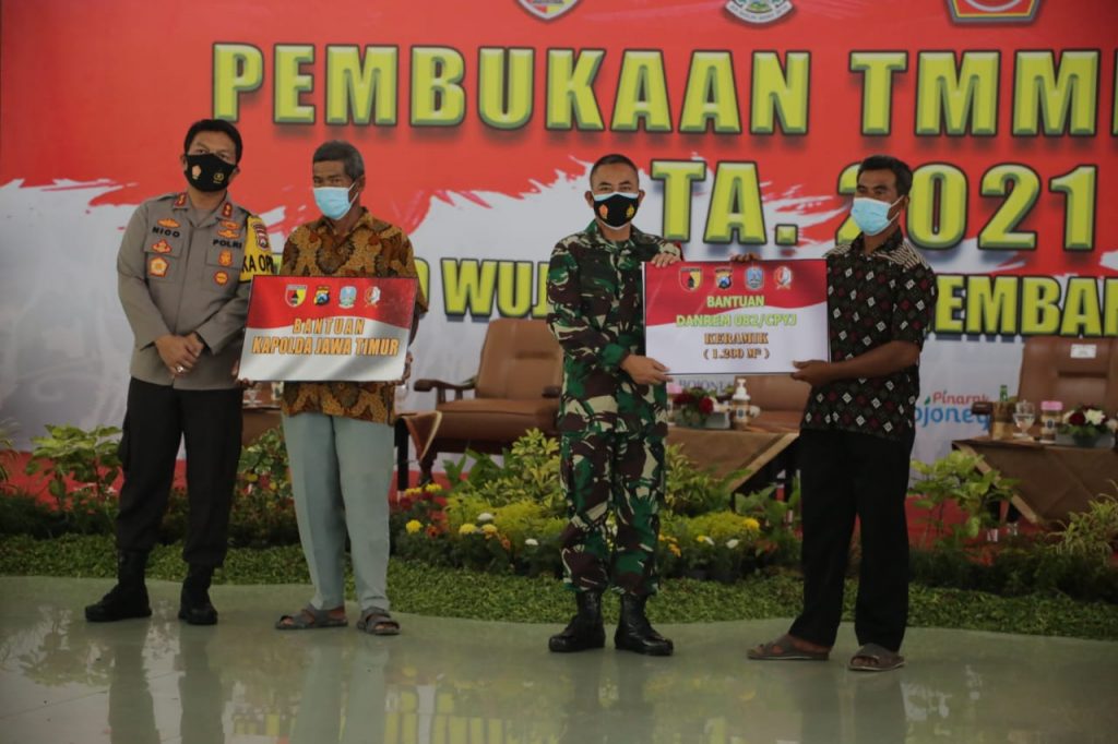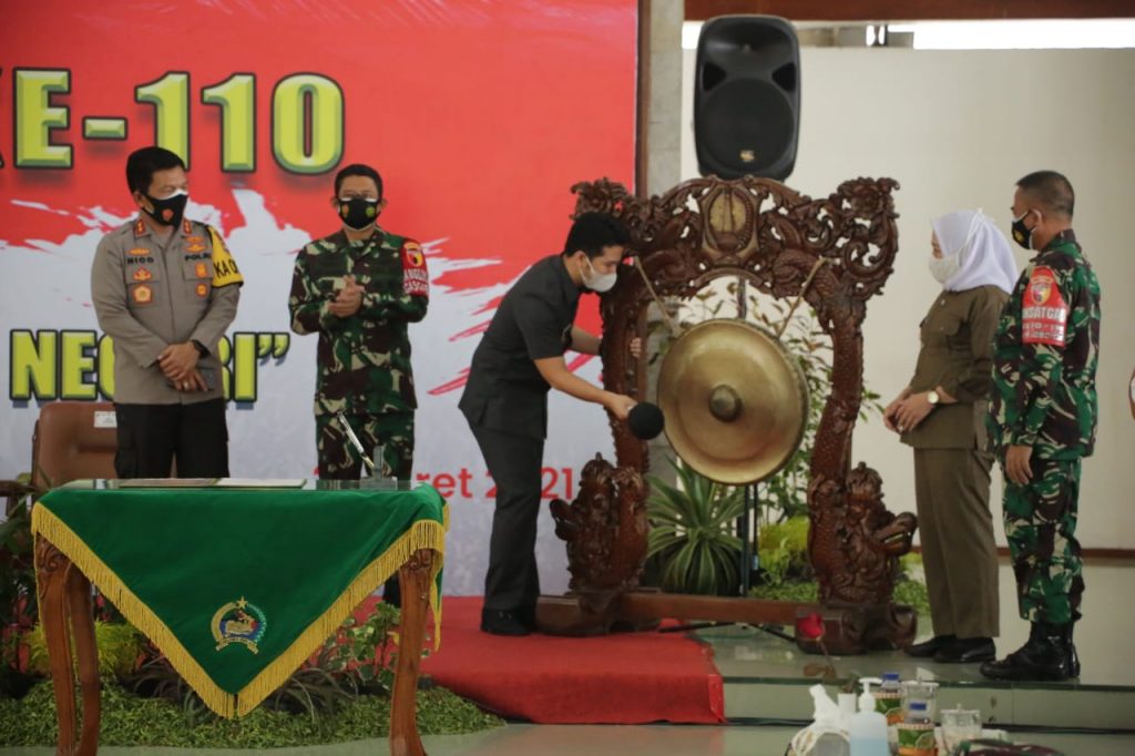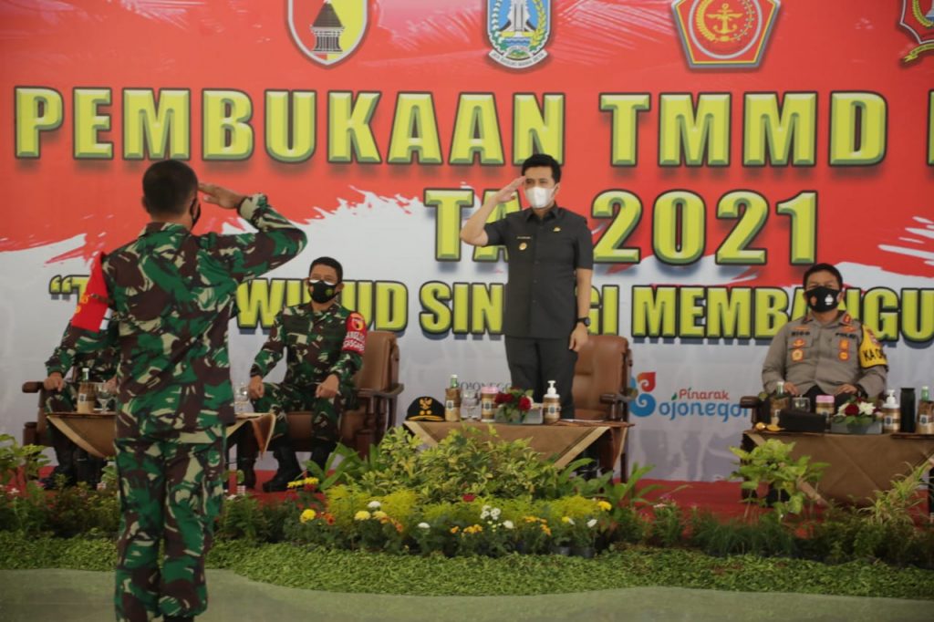 BOJONEGORO – RI, Wakil Gubernur Jawa Timur, Emil Elestianto Dardak, dan Pangdam V Brawijaya, Mayjend TNI Suharyanto, bersama Kapolda Jawa Timur, Irjen Pol Nico Afinta, Selasa (2/3/2021) membuka TNI Manunggal Membangun Desa (TMMD) ke 110, Tahun Anggaran 2021, di pendopo Malowopati, Kabupaten Bojonegoro.
