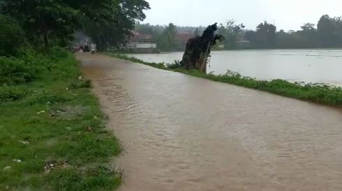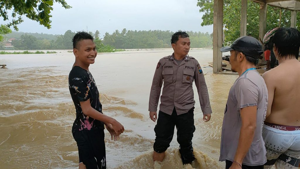 Desa Angon-angon, debit air hujan besar, meluap, dan sempat menggenang menghalangi akses jalan. Anggota Polsek Kangean melaksanakan pengamanan, pengaturan jalan dan membantu warga yang hendak menyeberang.