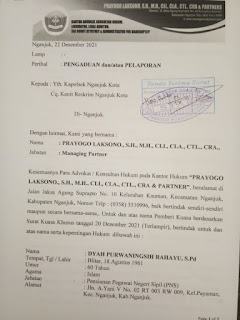 NGANJUK – RI, Prayogo Laksono, S.H., M.H., CLI., CLA., CTL., CRA., Managing Partner Kuasa hukum Dyah Purwaningsih Rahayu, S.Pd., salah satu Anggota Koperasi Guyub Rukun, hari ini melaporkan secara resmi atas dugaan Pelaku dugaan penggelapan dan/atau penipuan terhadap klienya.