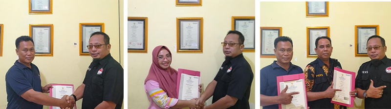 Penyerahan Sertifikat Kompetensi Wartawan kepada Yadi, Imam Wahyudi dan Maya panggilan akrab dari Mahanani Dewi Mayangsari dilakukan Kepala TUK SWI, Dedik Sugianto, di Kantor TUK SWI jalan Kedung Anyar 7/50 Surabaya.