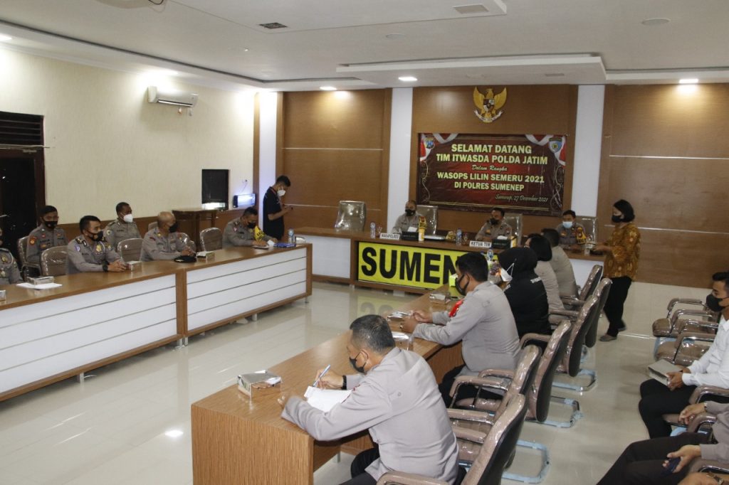 SUMENEP – RI, Polres Sumenep menerima Kunjungan Tim Itwasda Polda Jatim Dalam Rangka Wasops Lilin Semeru 2021.Tenpat Aula Sutanto Polres Sumenep Jl Urip Sumoharjo No.35 Desa Kolor Kec Kota Kab Sumenep Madura Jawa Jatim. Senin 27 Desember 2021. Pukul 08.45. Wib.