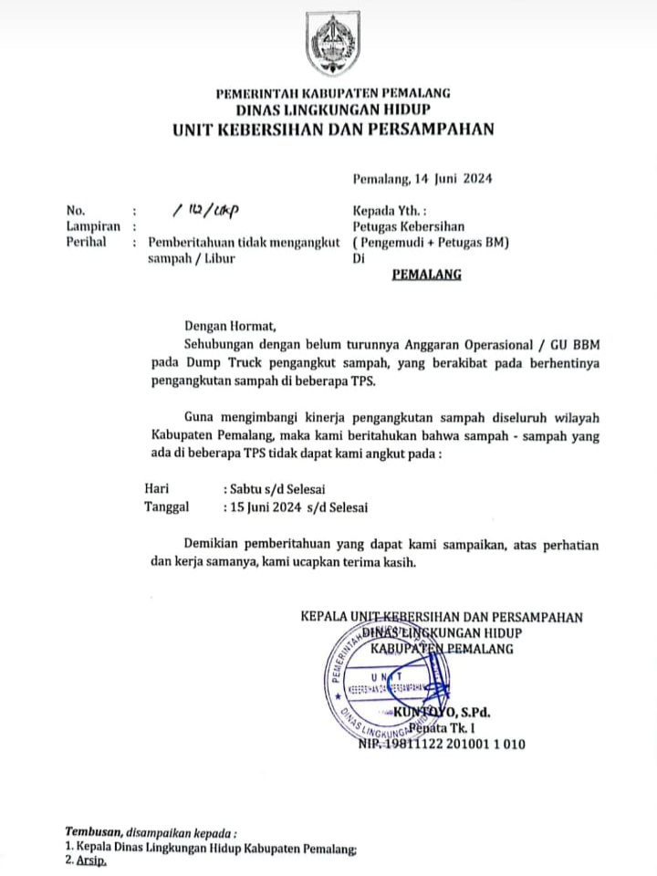 Dalam surat itu disebutkan bahwa mulai tanggal 15 Juni 2024, armada truk pengangkut sampah agar berhenti dulu, karena anggaran untuk beli BBM belum turun.