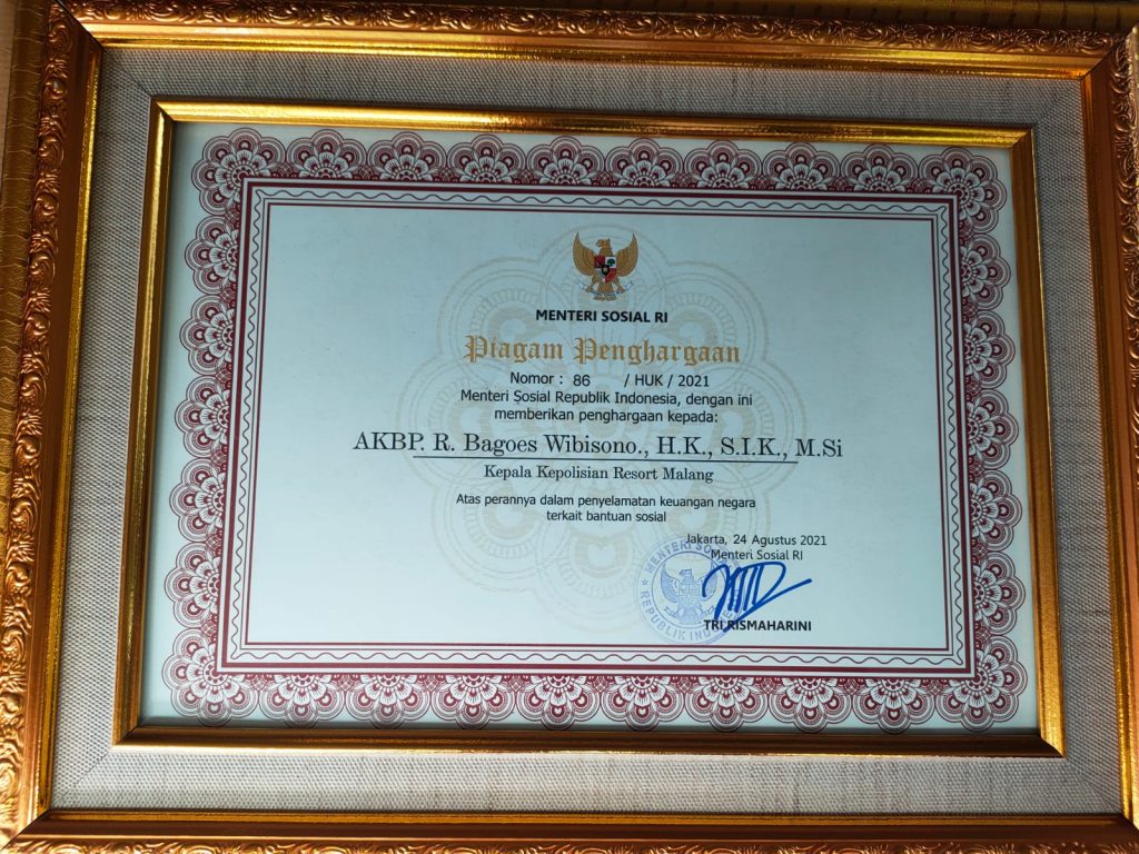 MALANG – RI, Kapolres Malang AKBP R. Bagoes Wibisono menerima penghargaan dari Kementerian Sosial (Kemensos) RI, dalam rangka Pemberian Penghargaan kepada Aparat Penegakan Hukum (APH) yang telah membantu penyelamatan Keuangan Negara terkait Bantuan Sosial, Selasa (24/8/2021) pagi.